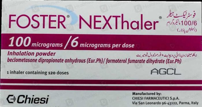 **In Summary:** Foster Nexthaler 100/6 is a maintenance inhaler combining an anti-inflammatory steroid (beclometasone 100mcg) and a long-acting bronchodilator (formoterol 6mcg) per dose. It’s used twice daily via the breath-actuated Nexthaler device to control chronic asthma and severe COPD. It is crucial to use it as prescribed, have a rescue inhaler available, rinse the mouth after use, and attend regular medical check-ups.