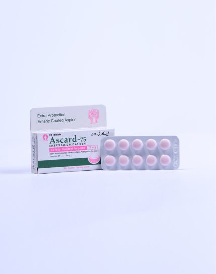 Ascard 75mg Tablet is a medication commonly prescribed to reduce the risk of heart attack and stroke in patients with a history of cardiovascular disease or those at risk due to factors such as high blood pressure or diabetes. It contains aspirin, which belongs to a class of drugs known as antiplatelets. Aspirin helps prevent blood clots by inhibiting the action of platelets, thus reducing the likelihood of clot formation in the arteries. This medication is typically taken once daily under medical supervision.